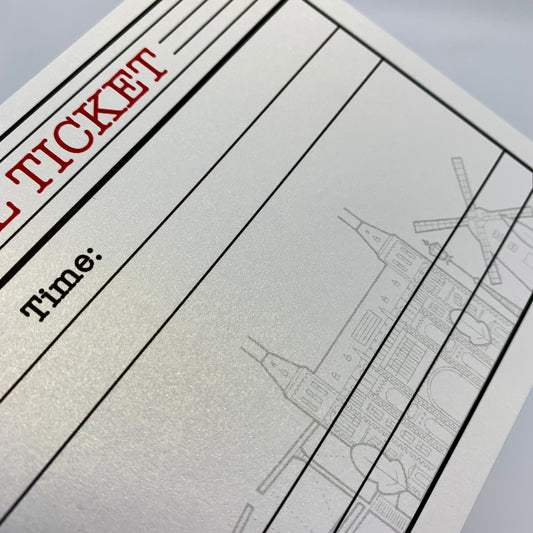 Amsterdam Travel Ticket (White with Gold Shimmer) & Envelope. Amsterdam holiday themed DIY gift