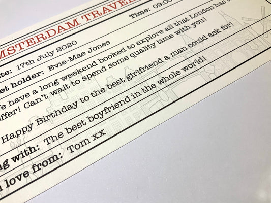 Amsterdam Personalised Travel Ticket & Envelope. Amsterdam holiday themed gift