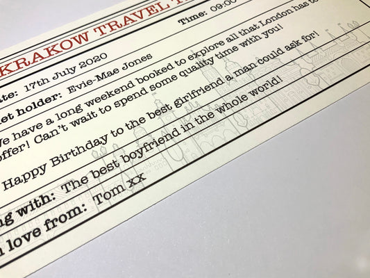 Krakow Personalised Travel Ticket & Envelope. Krakow holiday themed gift
