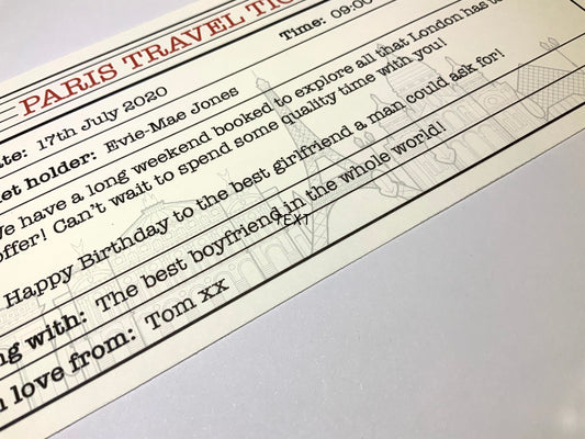 Paris Personalised Travel Ticket & Envelope. Paris holiday themed gift