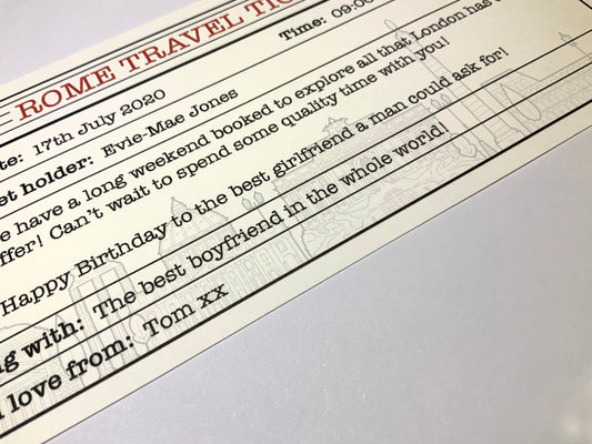 Rome Personalised Travel Ticket & Envelope. Rome holiday themed gift